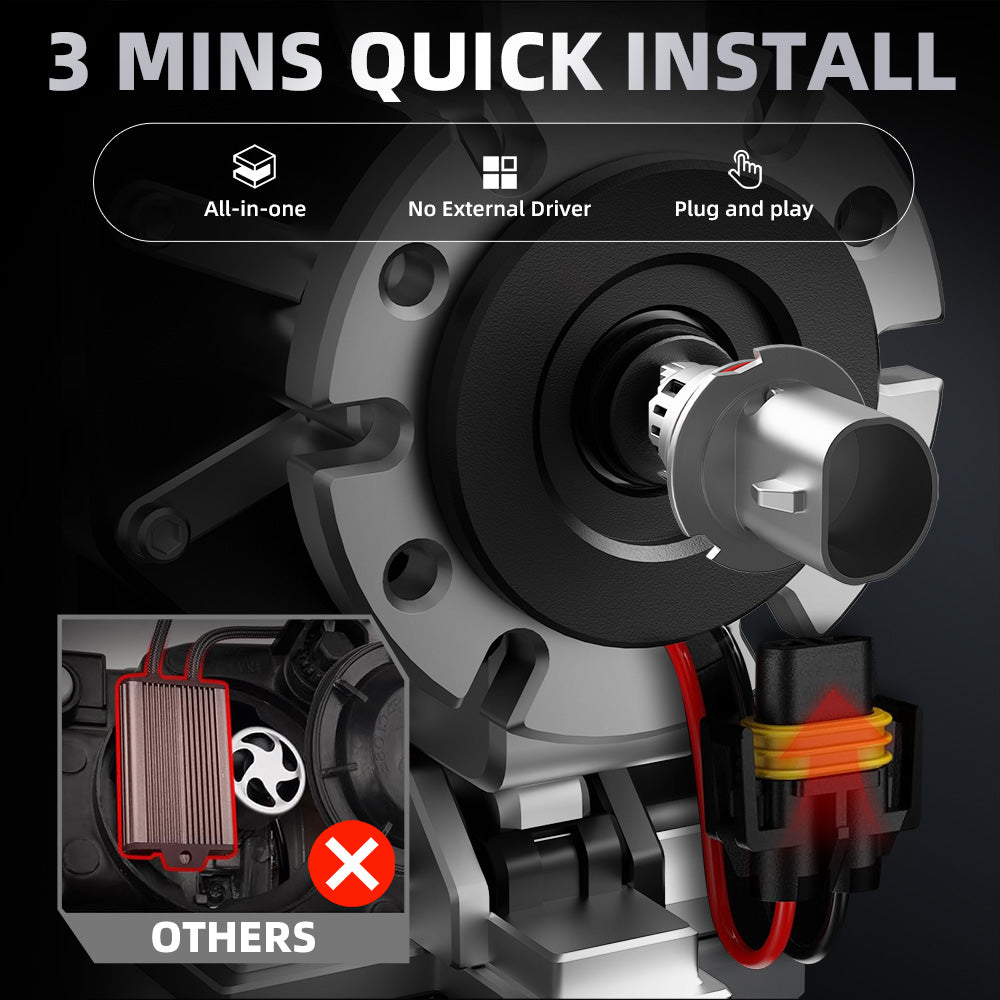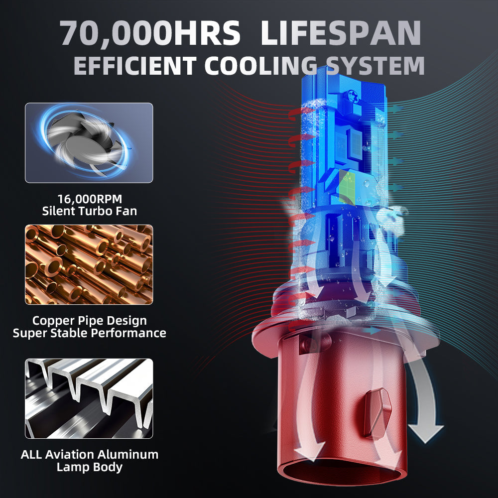 3rd-gen ultra-bright chips deliver max 5x the luminosity of OEM lights. Silent 15,000RPM cooling blades provide top-tier heat dissipation. Full-body die-cast construction ensures superior durability and aesthetics.