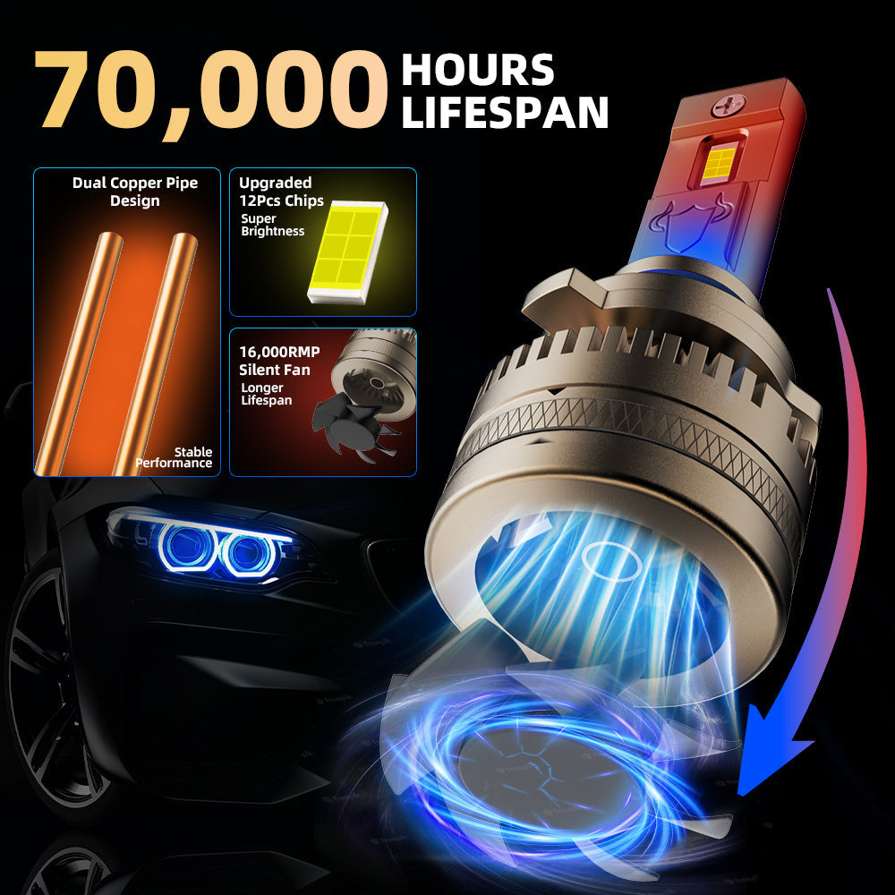 3rd-gen ultra-bright chips deliver max 5x the luminosity of OEM lights. Silent 15,000RPM cooling blades provide top-tier heat dissipation. Full-body die-cast construction ensures superior durability and aesthetics.