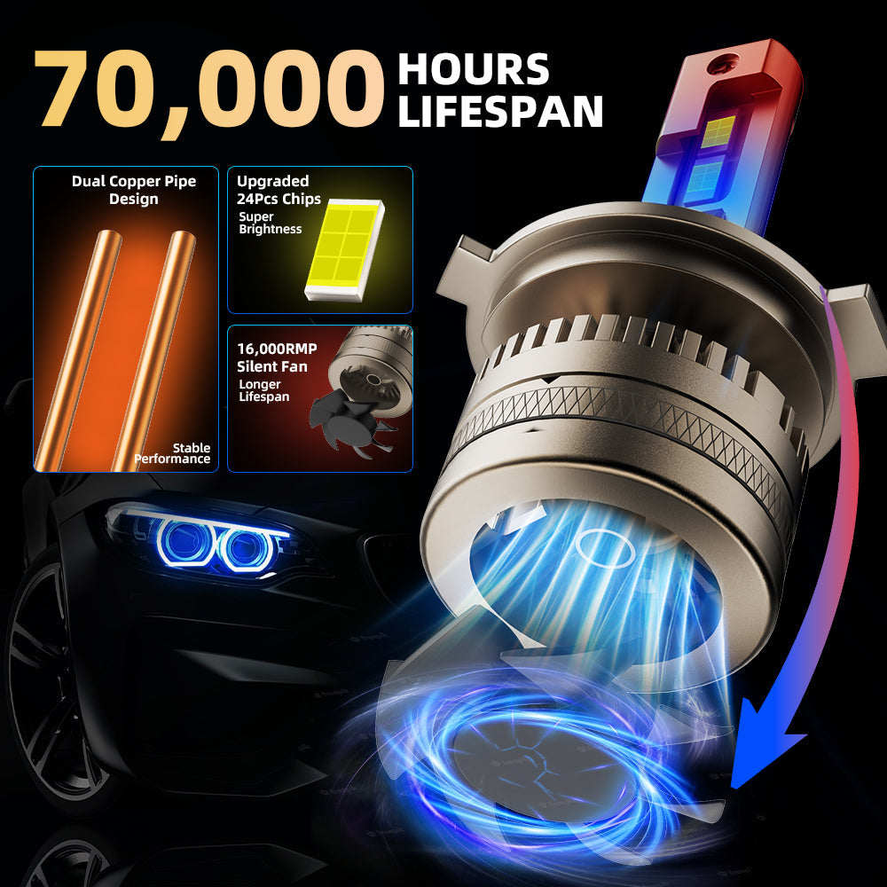 3rd-gen ultra-bright chips deliver max 5x the luminosity of OEM lights. Silent 15,000RPM cooling blades provide top-tier heat dissipation. Full-body die-cast construction ensures superior durability and aesthetics.