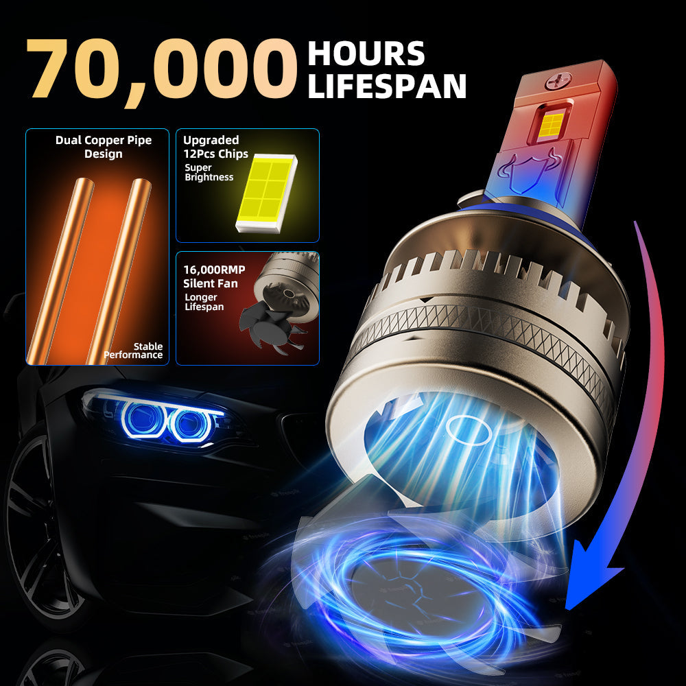 3rd-gen ultra-bright chips deliver max 5x the luminosity of OEM lights. Silent 15,000RPM cooling blades provide top-tier heat dissipation. Full-body die-cast construction ensures superior durability and aesthetics.