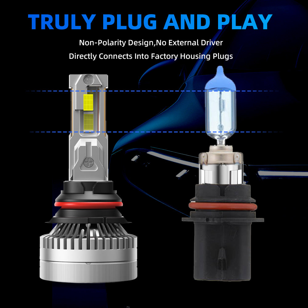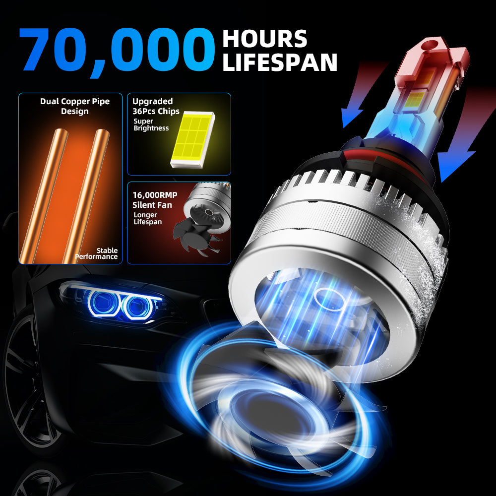 3rd-gen ultra-bright chips deliver max 5x the luminosity of OEM lights. Silent 15,000RPM cooling blades provide top-tier heat dissipation. Full-body die-cast construction ensures superior durability and aesthetics.